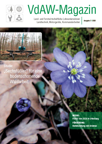 Die Ausgabe 2 / 2026 des VdAW-Magazins für Forstunternehmer, landwirtschaftliche Lohnunternehmer sowie den Landtechnik- und Motorgeräte-Fachhandel wird um den 20. März an alle Mitglieder der entsprechenden Fachgruppen sowie an alle DFSZ-zertifizierten Betriebe und an alle Mitglieder des FUV-RLP versendet.